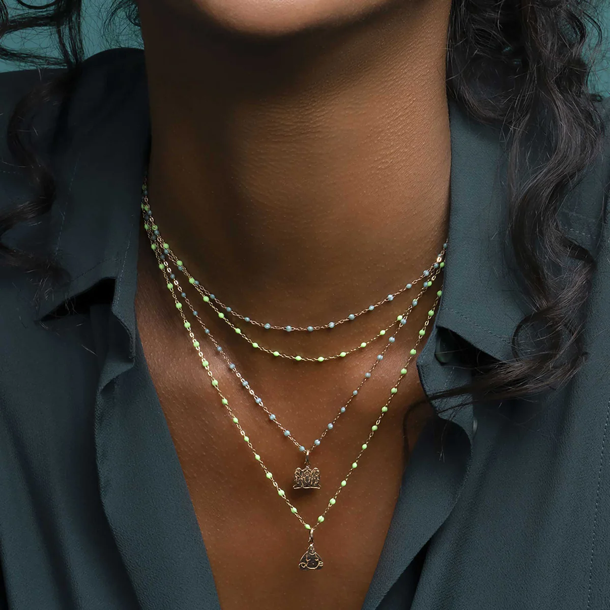 Price range: €395,00 through €470,00De sieraden van Gigi Clozeau worden gemaakt in het familieatelier. Ze gebruiken uitsluitend de beste materialen: 18-karaats goud en een sublieme kalkvernis, bekend om zijn glans en kwaliteit. Deze hoogwaardige hars zorgt voor een rijk palet. De ambachtelijke toepassing ervan op geel-, rosé- en witgouden kettingen is een ware kunst, het resultaat van 50 jaar expertise van Alain Clozeau.