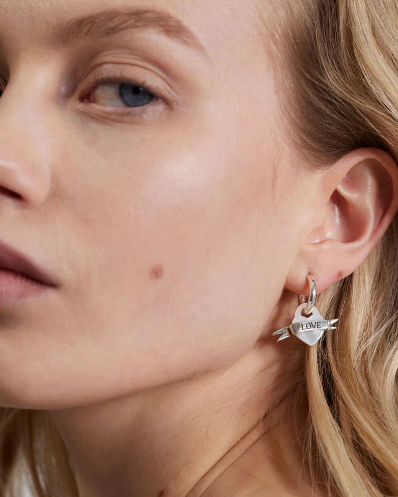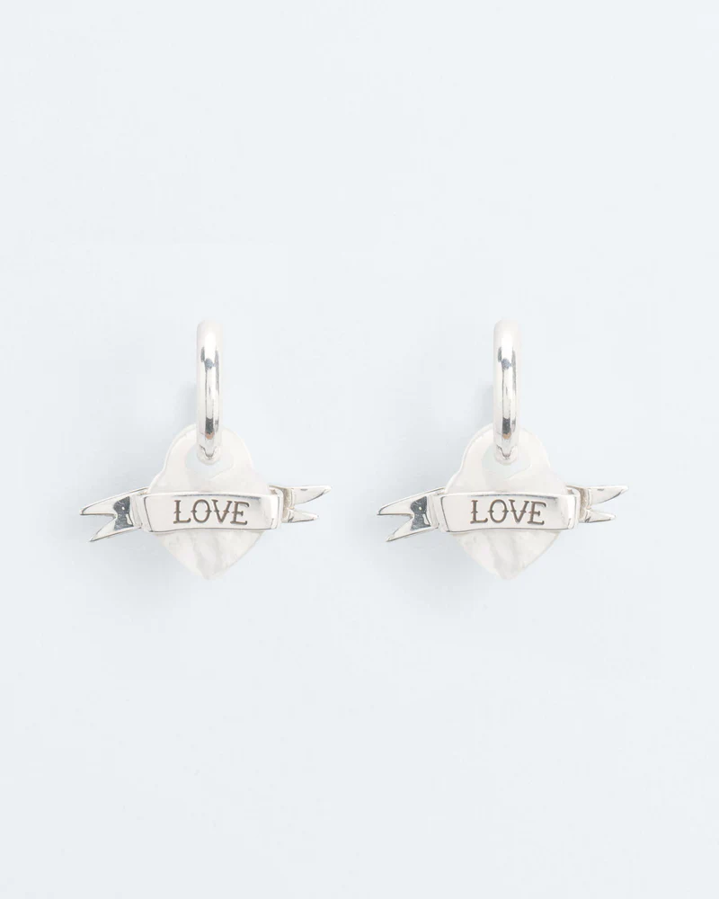 Net als de old-school tatoeages die werden gedragen door degenen die het onbekende tegemoet voeren, zijn deze hoepeloorbellen met getatoeëerde hartvormige hanger een uiting van toewijding. Een eerbetoon aan degenen die we met ons meedragen, waar het tij ons ook heen voert.