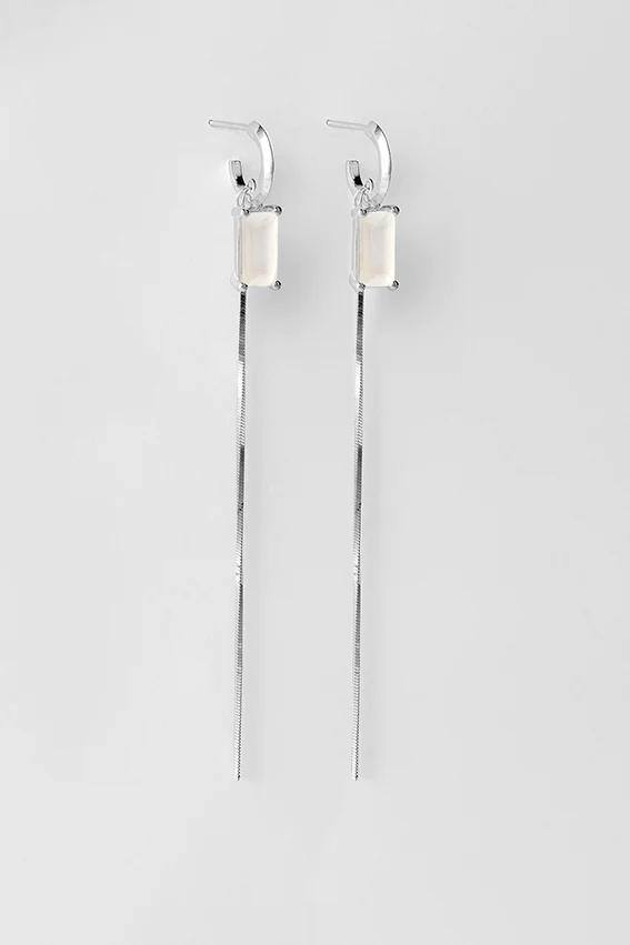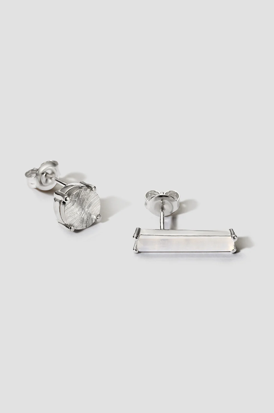 €245,00Een delicate balans tussen textuur en licht. De ene oorbel heeft een ronde zilveren schijf gegraveerd met subtiele diepte; de andere een strakke staaf bezet met een maansteen. Samen creëren ze een asymmetrische harmonie.