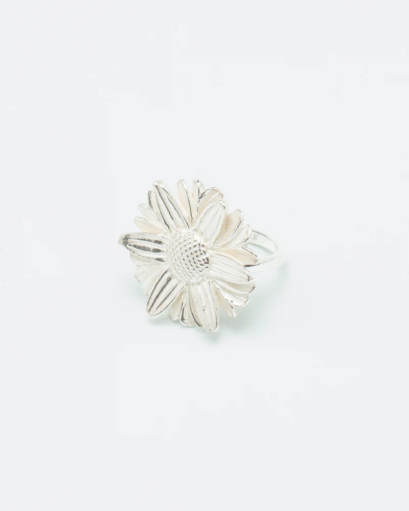 De tijd verstrijkt onherroepelijk, maar onze zilveren madeliefjes zijn eeuwigdurend – deze statement ring met madeliefje is een speels en fladderend tegengif voor het heden.