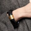 Brede bumper bangle van gelakte hars in zwart met witte details en mat gouden slot. De mat gouden details zijn verguld op longlasting stainless steel.