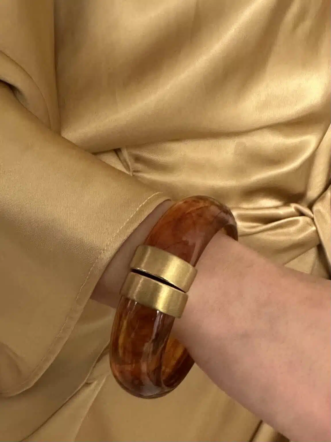 Brede bumper bangle van gelakte hars in cognac-bruin mêlée en mat gouden slot. De mat gouden details zijn verguld op longlasting stainless steel.