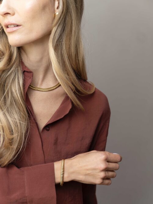 Vergulde bangle met geribbeld patroon. Sluiting met kliksysteem. Goldplated op longlasting stainless steel.