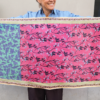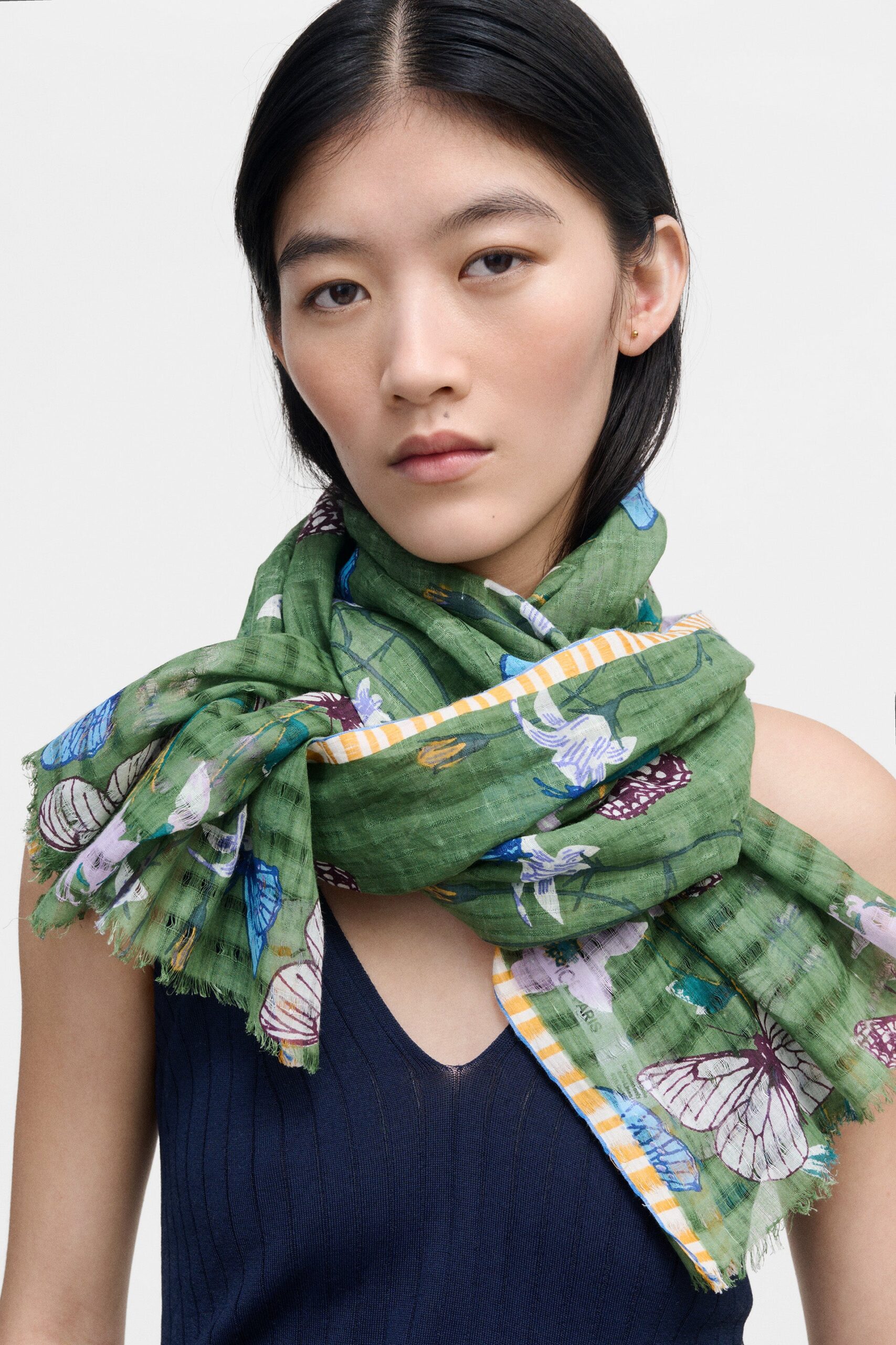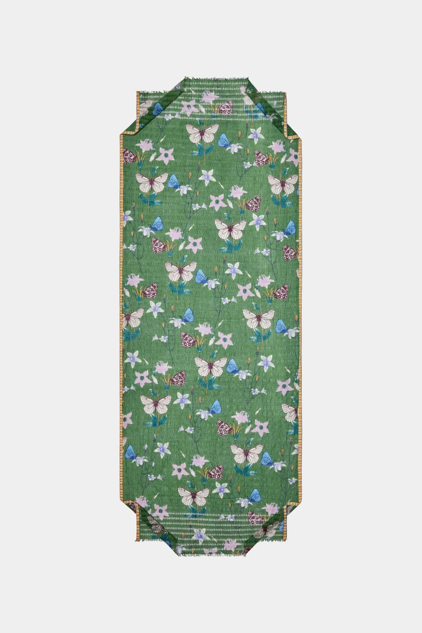 Handgeweven sjaal met een fijn ruitpatroon. Vloeiende en luchtige valling. Poëtisch ontwerp dat doet denken aan een droomachtige natuur, gedragen door een zacht kleurenpalet en subtiele diepte-effecten. Bij het knopen verstrengelen vlinders en bloemen zich op luchtige wijze. Jacquardrand en afwerking met fijne franjes. Ambachtelijke zeefdruk; één raam per kleur.