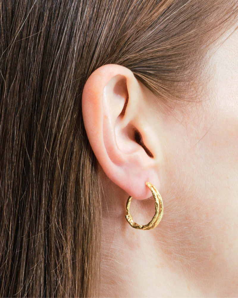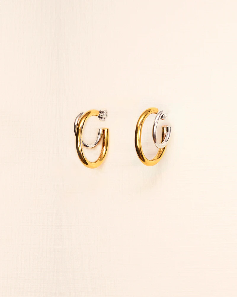 Het idee van deze oorbellen is gebaseerd op het trompe l’oeil-effect door gebruik te maken van de dubbele hoepels. Eén juweel dat op twee lijkt.