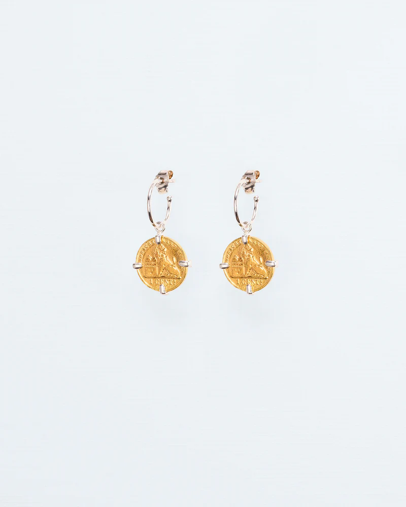 Uit de vaste collectie ‘La Fête des Bêtes’: Met een knipoog naar het surrealisme buigt deze collectie de traditionele regels van het juweliersvak om en belichaamt ze alles waar Wouters&Hendrix zo dol op is. Sieraden gebaseerd op munten die verzameld zijn op rommelmarkten, maken al jaren deel uit van onze collecties. Als eigentijdse twist hebben we de zetting zichtbaar onderdeel gemaakt van het ontwerp.