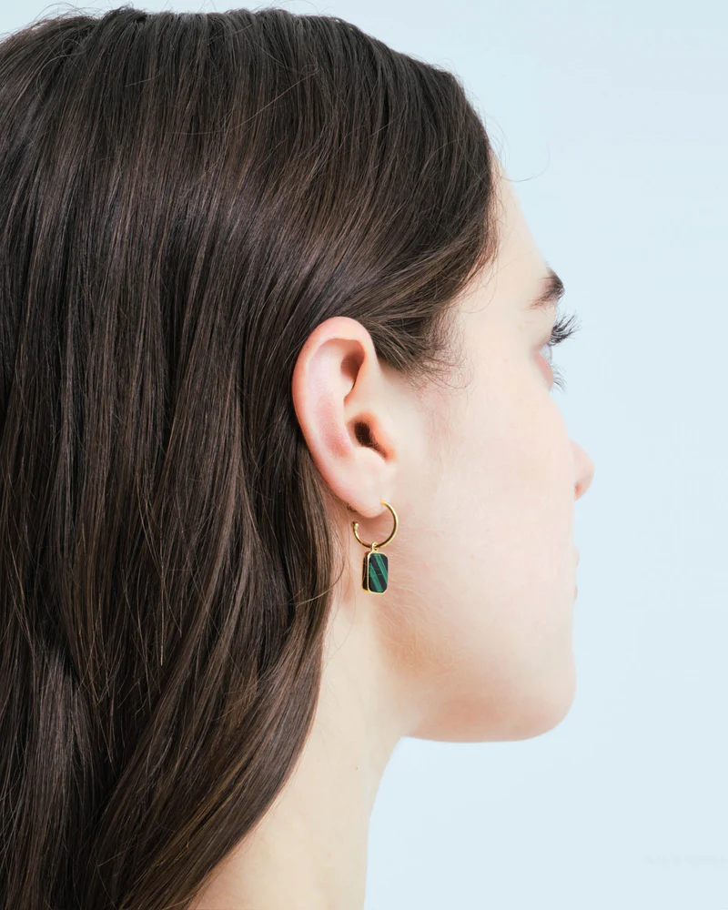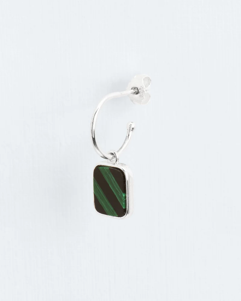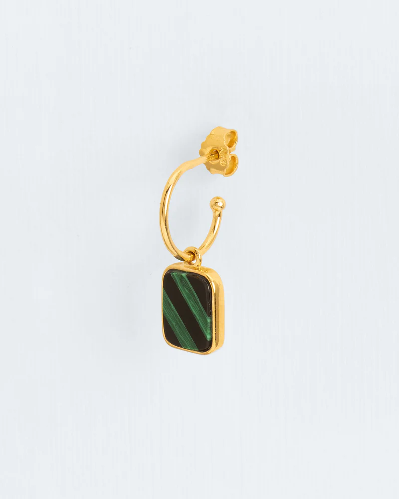De minimalistische oorring laat de malachiet stralen, zeker in contrast met de onyx. Een eeuwenoude schoonheid die al paleizen heeft versierd.
