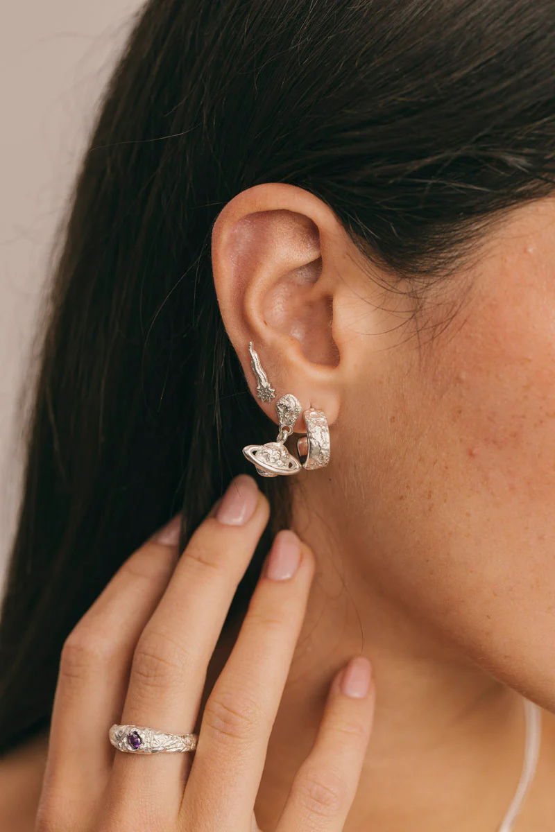 €30,00Verhoog je look met de Etheral Haze Hoop. Deze brede hoepel oorbellen zijn voorzien van een gedetailleerde Saturnus print op de stud, een mix van organisch design met kosmische inspiratie voor een unieke en verfijnde toevoeging aan je sieraden collectie.
