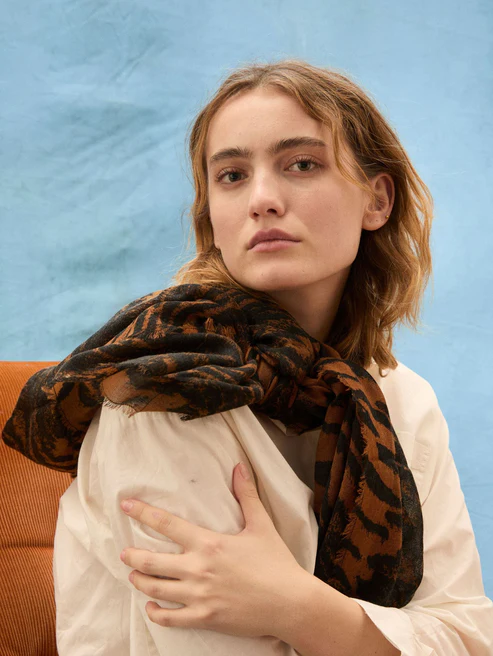 Tigarea Woo sjaal is een elegante sjaal, voorzien van een prachtige print die een verfijnde touch toevoegt aan elke outfit. Het verfijnde ontwerp maakt het de perfecte accessoire om rond de nek te dragen of gedrapeerd over de schouders voor een luxe en stijlvolle upgrade van je look.