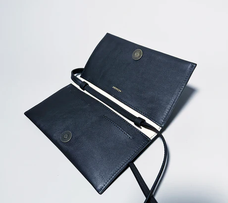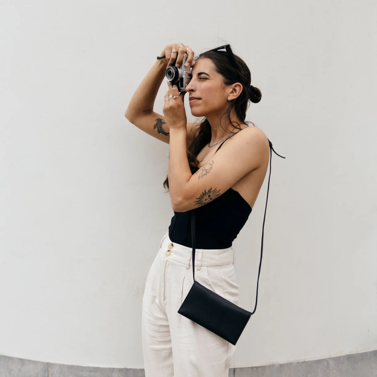 In dit slanke, praktische ontwerp passen je zonnebril, je telefoon en verschillende pasjes.