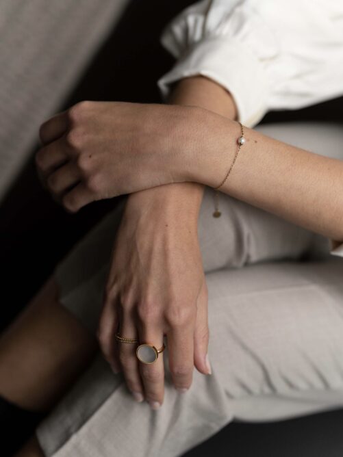 Fijn verguld armbandje met een pareltje. Het armbandje is voorzien van een verlengkettinkje. De basis van dit armbandje is een longlasting stainless steel.
