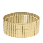 Brede vergulde bangle met rechthoek patroon. Verguld op een basis van longlasting stainless steel. De breedte van deze glanzende armband is 3cm. Deze rekbare armband past altijd.