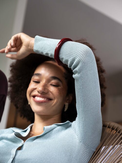 Bangle gemaakt van gelakte hars in een platte organische vorm in diepe bordeaux rode kleur.