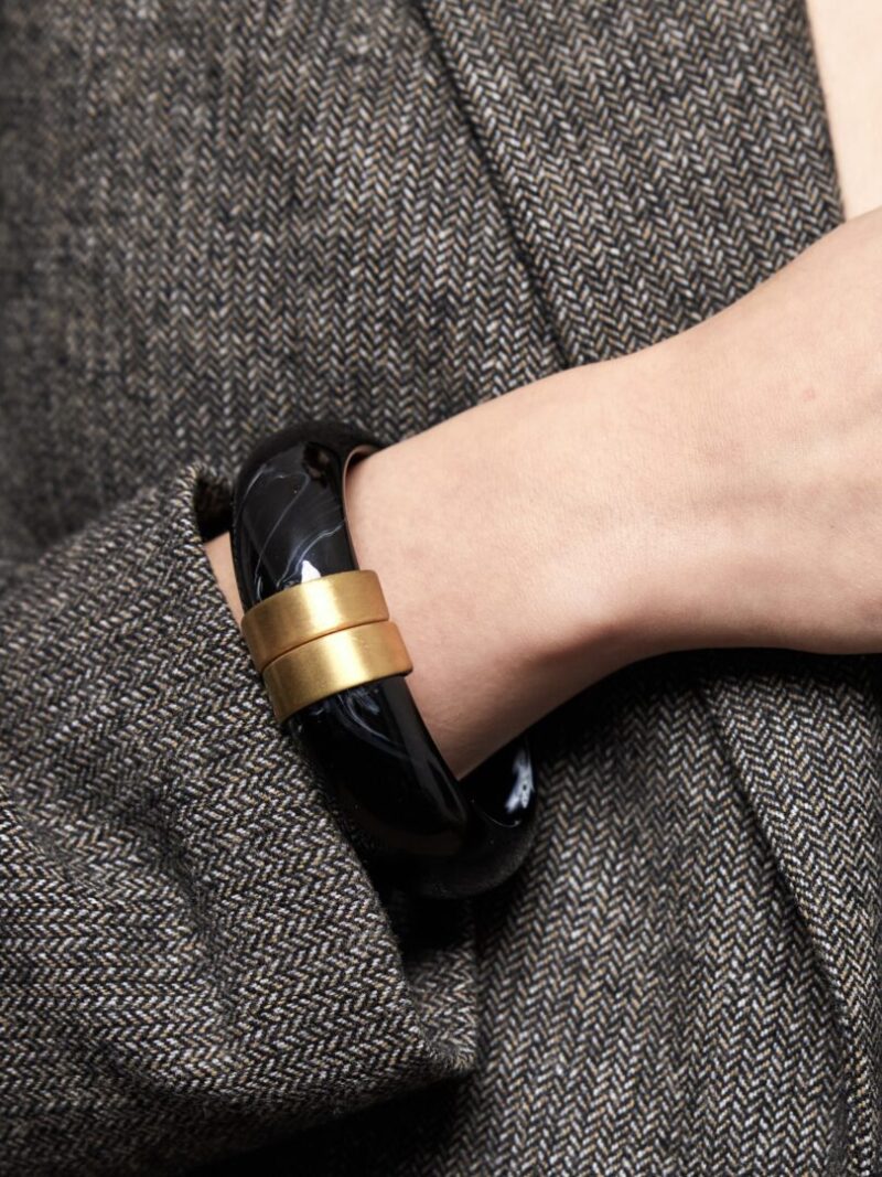 Brede bumper bangle van gelakte hars in zwart met witte details en mat gouden slot. De mat gouden details zijn verguld op longlasting stainless steel.