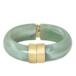 Brede bumper bangle van gelakte hars in zeegroen mêlée en mat gouden slot. De mat gouden details zijn verguld op longlasting stainless steel.