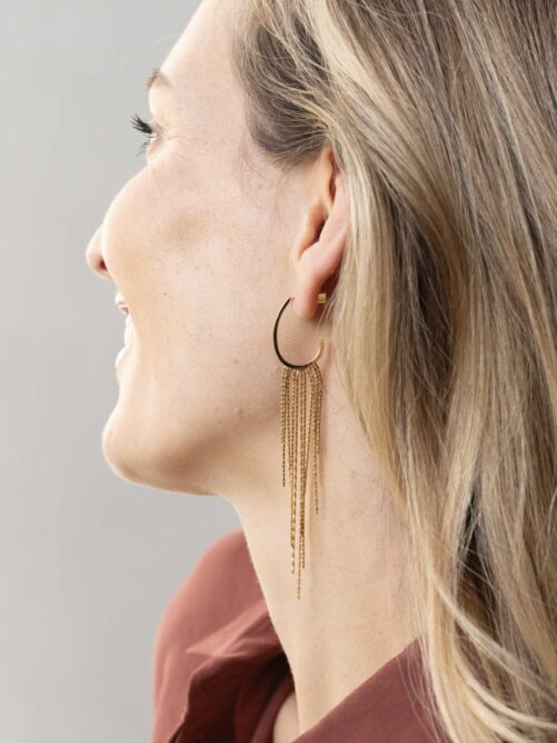 Lange “party” oorbellen. De lengte van de oorbellen is 10.5cm. Goldplated op longlasting stainless steel.