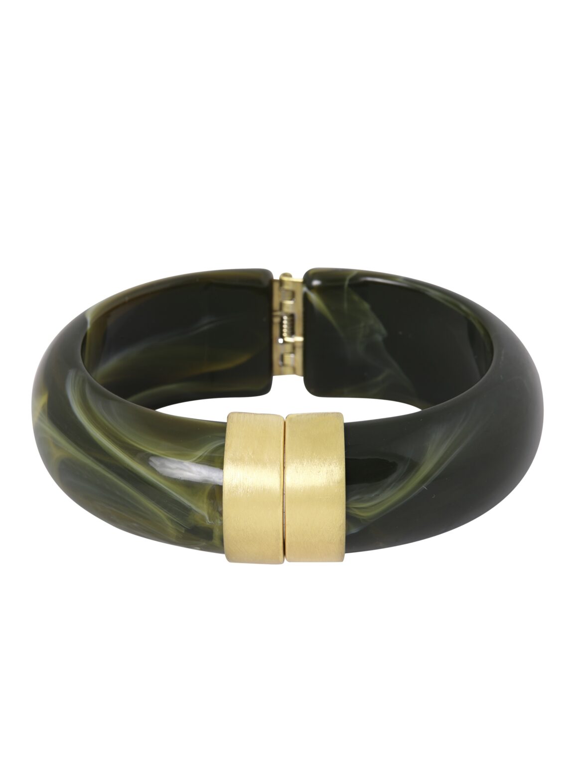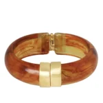 Brede bumper bangle van gelakte hars in cognac-bruin mêlée en mat gouden slot. De mat gouden details zijn verguld op longlasting stainless steel.