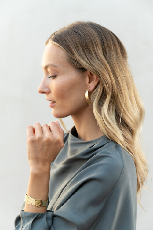Vergulde platte creole. De lengte is 4cm en de breedte is ca 1cm. De basis is brass met een extra sterke goudplating met gehamerde structuur.