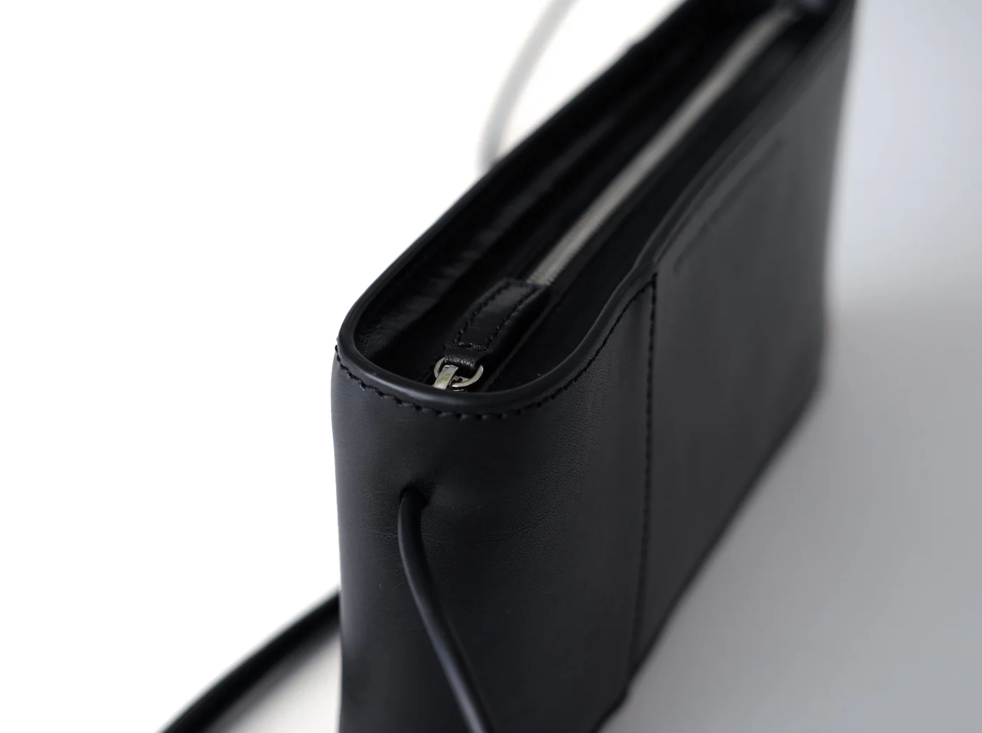 Afwerking: volledig lederen (daim) interieur, gesloten met rits. Bevat 1 hoofd compartiment met rits, daarnaast nog twee zij compartimenten. Binnen het hoofd compartiment bevindt zich nog een steekzak om je telefoon bij de hand te houden. Schouderband gemaakt van rubber met lederen handvat.