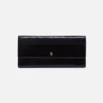De lederen jill portefeuille vouwt helemaal open en onthult plaats voor kaarten, biljetten en munten. De portefeuille gesloten aan de hand van een drukknop.