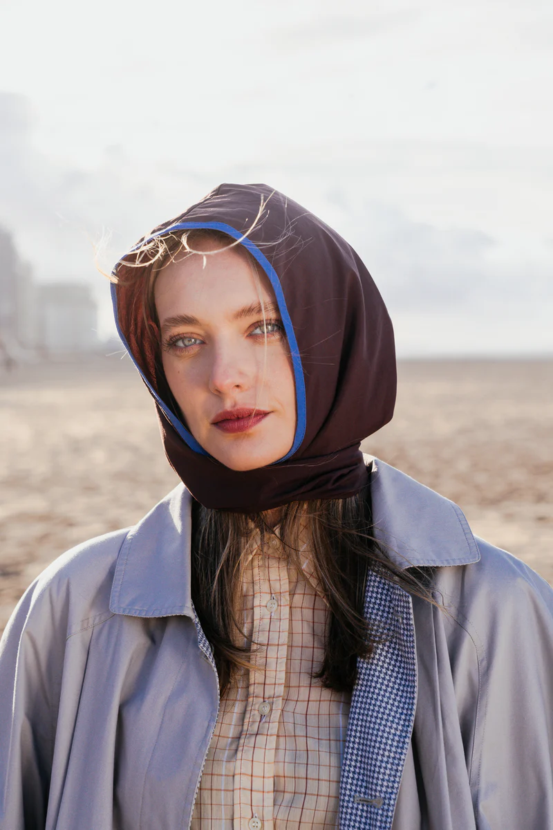 De Tasnim RAINCAP is een warme, melkchocoladebruine kleur, gemaakt van een rijke dode voorraad stof van Maison Kitsuné, gecombineerd met een koele jeansblauwe rand voor een evenwichtige, elegante look.