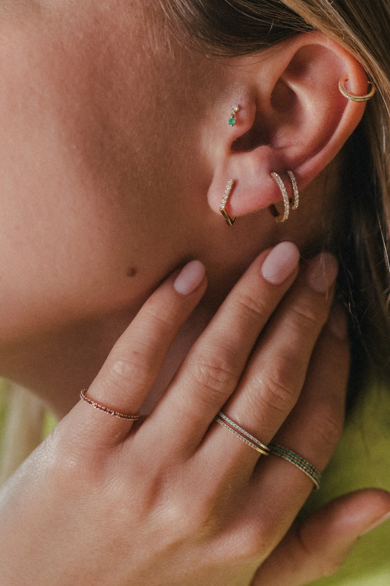 De ontwerpen zijn uniseks, grafisch en discreet. Denk aan fijne lijnen, zachte symboliek en een zweem van moderne spiritualiteit. Gaëlle’s fascinatie voor kleine rituelen en gelukssymbolen vertaalt zich in sieraden die niet alleen mooi zijn, maar ook iets betekenen. Van subtiele “grigris” tot sprankelende steentjes in tinten groen: elk juweel draagt een persoonlijke energie met zich mee.