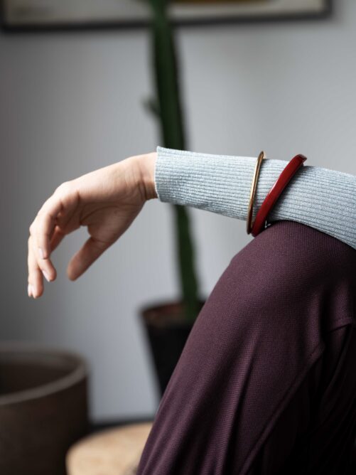 Bangle gemaakt van gelakte hars in een platte organische vorm in diepe bordeaux rode kleur.